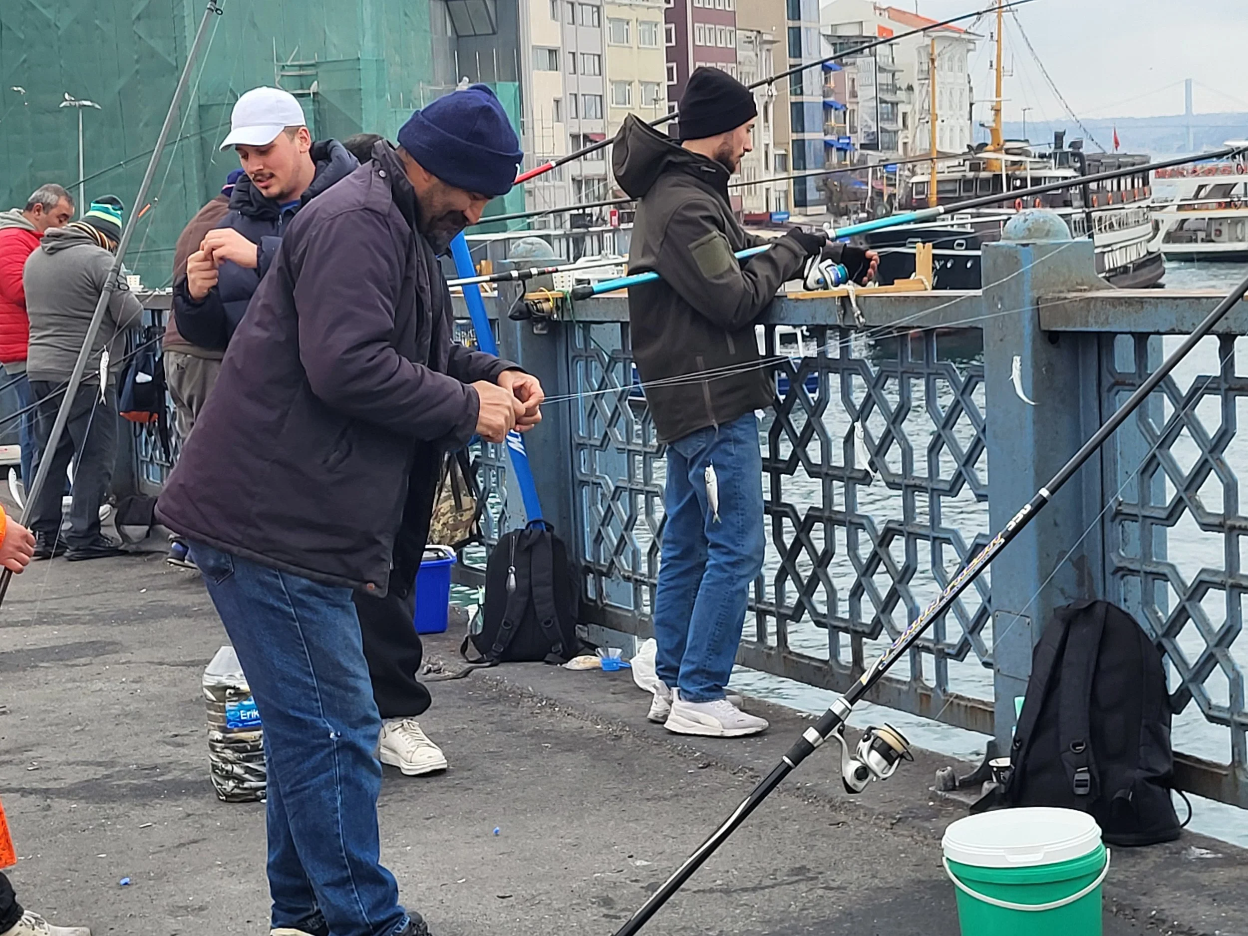 Siltoja joilta tupakoivat miehet pyydystävät pikkukaloja.